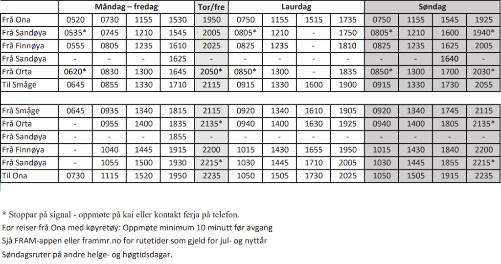 Den første tabellen viser fergene fra Ona til Småge, og nedenfor finner du den motsatte retningen, fra Småge til Ona. Vær også oppmerksom på at lørdager og søndager har andre rutetider og mindre hyppige avganger ettersom det vanligvis er færre passasjerer. Dessverre er det ikke mange ferger tilgjengelig hver dag, så prøv å ikke gå glipp av din og vær i god tid til avgang, 10 minutter i forveien. Ellers må du kanskje vente lenge på neste avgang.